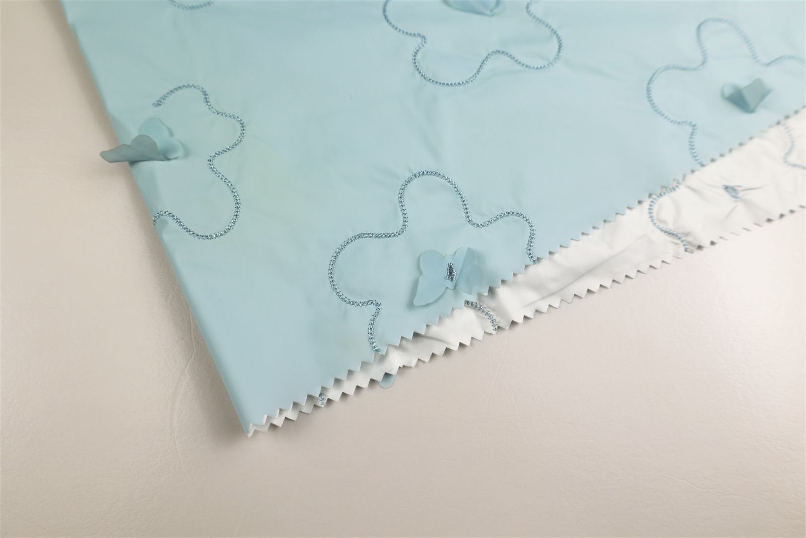 激光繡小花,加持夜光反光的蝴蝶作以點綴,花型立體,使面料賦有生機。